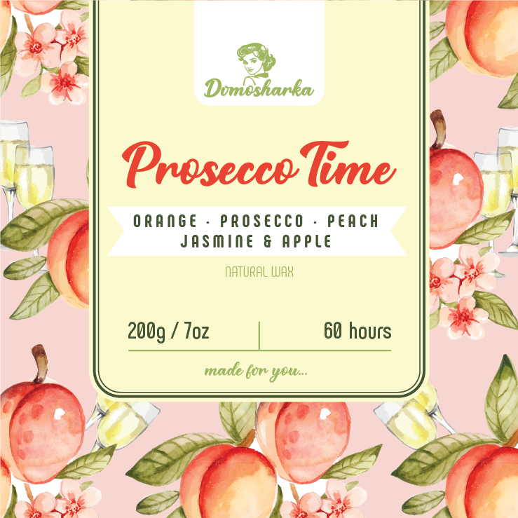 PROSECCO TIME – е ръчно изработена ароматна свещ, вдъхновена от класическият коктейл на Венеция - Белини. Всяко запалване ще ви пренесе в свят на елегантност, свежест и наслада, обгръщайки ви с изискани плодови нюанси и фина сладост.